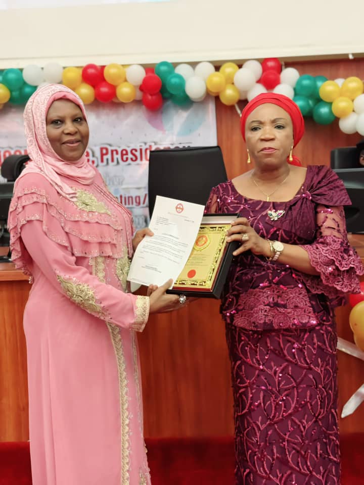 National Coordinator and Chief Executive Officer of SERVICOM, Mrs. Nnenna Akajemeli (Left) presenting a special recognition award of excellent service delivery to the Head, SERVICOM Unit of the Nigerian Maritime Administration and Safety Agency (NIMASA), Hajia Rakiya Lamai who represented the DG/CEO NIMASA. During the annual end-of-year awards/meeting of the National Council of Nodal Officers with the SERVICOM Office, held in Abuja.