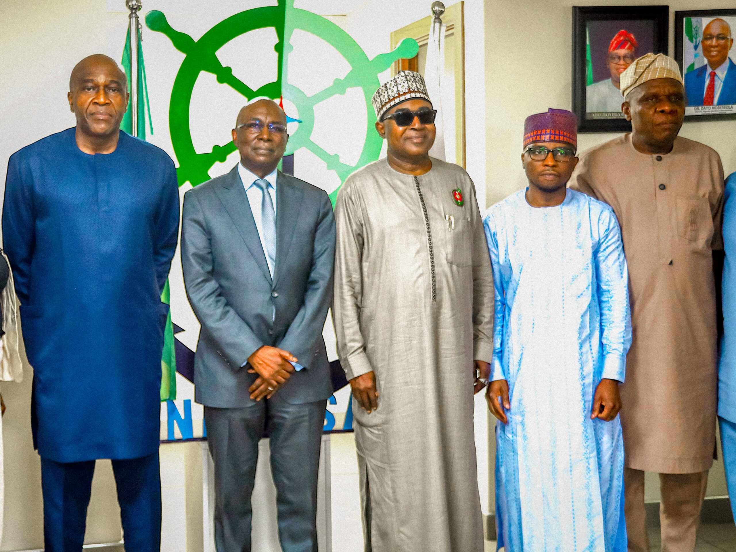 L-R: Executive Director, Administration and Finance, Nigerian Maritime Administration and Safety Agency, NIMASA, Chudi Offodile; Director General, NIMASA, Dr. Dayo Mobereola; Chairman/Chief Executive of the National Drug Law Enforcement Agency, NDLEA, Brig. Gen. Buba Marwa (Rtd.), CON, OFR; Executive Director, Maritime Labour and Cabotage Services, NIMASA, Jibril Abba and Executive Director Operations, NIMASA, Engr. Fatai Taiye Adeyemi during a courtesy visit by the Chief Executive and Management of the NDLEA to the NIMASA Towers in Victoria Island, Lagos.