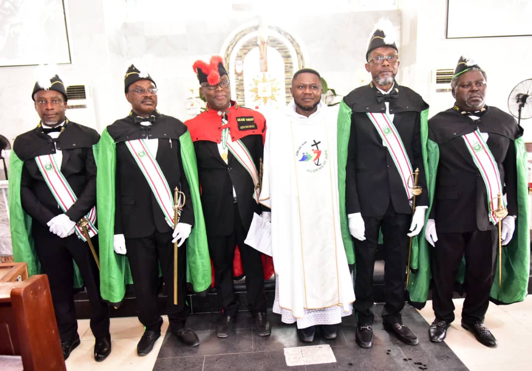 From left: Chuma Okeke, Valentine Omamogho, Sir Tony Ukairo (Grand Knight, VGC Subcouncil) Rev. Father Benjamin Ekpo( Parish Priest, Catholic Church of Epiphany, Ologolo, Lekki, Ogoegbunam Anazodo, and Festus Okudibe. At the 2nd Degree Investiture Ceremony of Knights of St. Mulumba, VGC Subcouncil. Held at Catholic Church of Epiphany Ologolo, Lekki, Lagos on Saturday 25th January 2025.