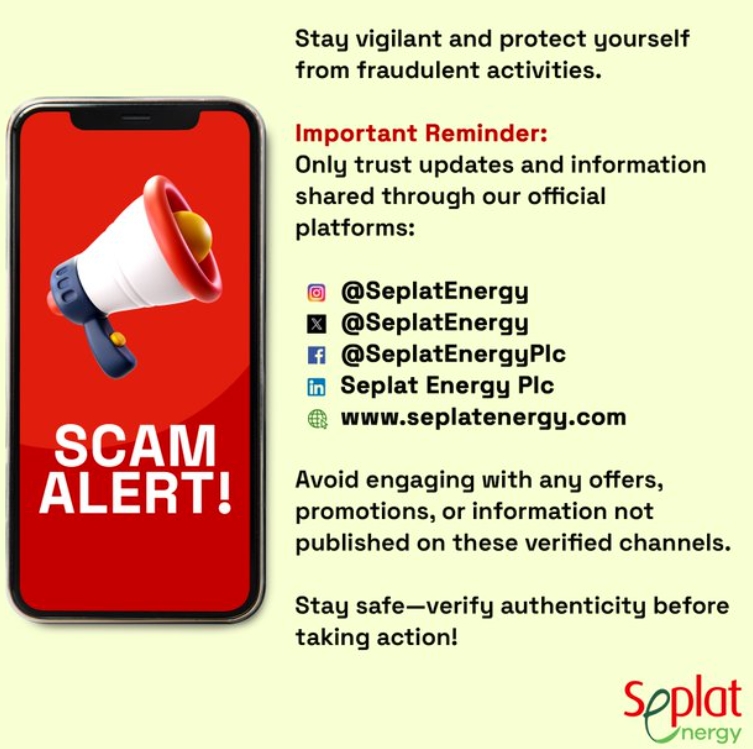 The company warned against engaging with any third-party promotions or unverified sources claiming to represent Seplat Energy. “Fraudsters continue to devise new tactics, and we urge the public to stay alert. Always cross-check information with our official platforms to avoid falling victim to scams,” the statement read.