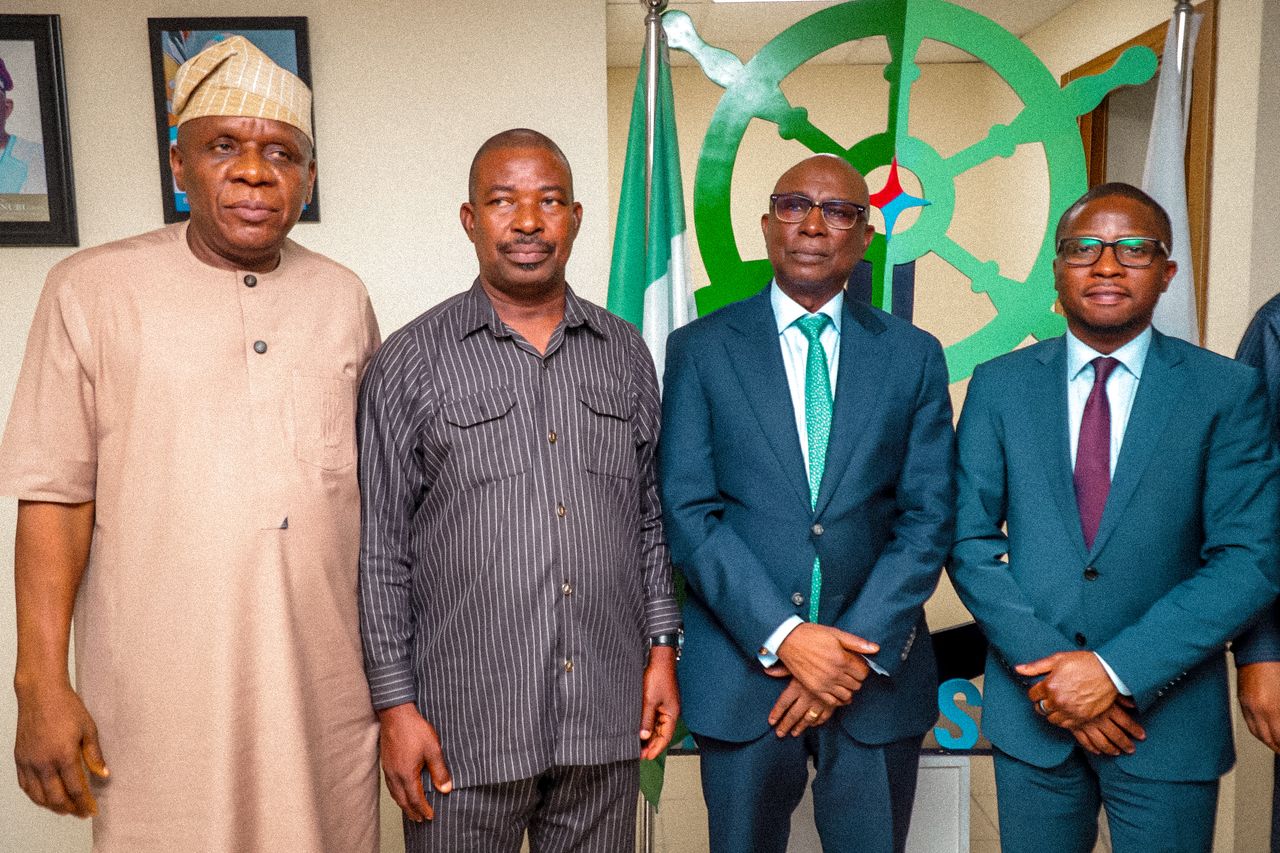 R-L: Executive Director, Maritime Labour and Cabotage Services, Nigerian Maritime Administration and Safety Agency, NIMASA, Jibril Abba; Director General, NIMASA, Dr. Dayo Mobereola; Secretary General of the Nigerian Merchant Navy Officers and Water Transport Senior Staff Association, NMNOWTSSA, Comrade John Aleakhue Okpono and Executive Director Operations, NIMASA, Engr. Fatai Taiye Adeyemi during a courtesy visit by the Secretary General of NMNOWTSSA at the NIMASA headquarters in Lagos.