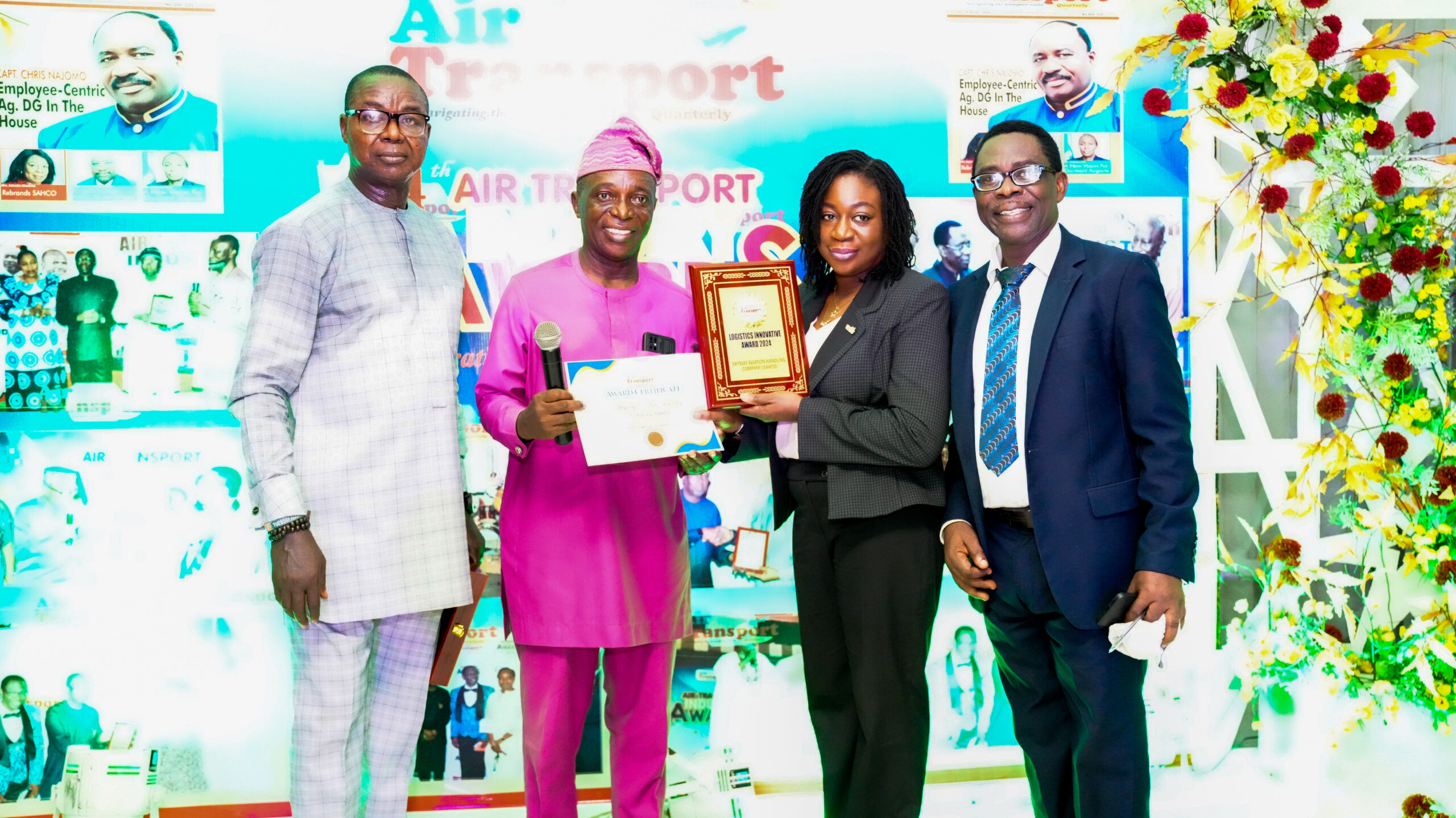 L-R: General Manager, Aerodrome Standards, Nigeria Civil Aviation Authority, Chukwu Emmanuel; Revd Olatunde Shoyemi; Head, Corporate Communications, Skyway Aviation Handling Company (SAHCO) PLC, Mrs Vanessa Uansohia; Publisher, Air Transport Quarterly Magazine, Prince Supo Atobatele during the award presentation to SAHCO
