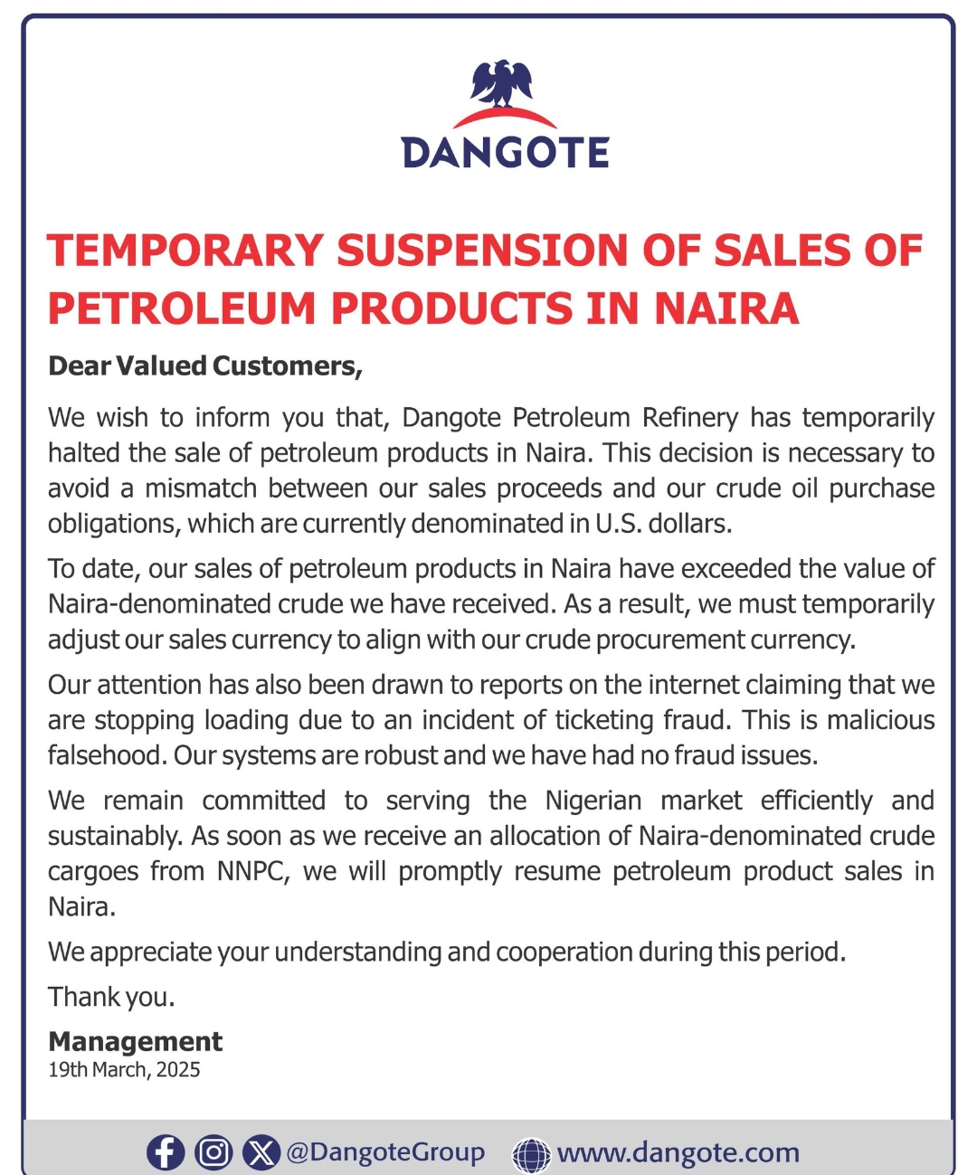 Adding to the tension, misinformation about ticketing fraud has circulated online, falsely suggesting that fraud issues led to the sales suspension. Dangote Refinery has strongly refuted these claims, reaffirming the integrity of its supply chain and operational systems.