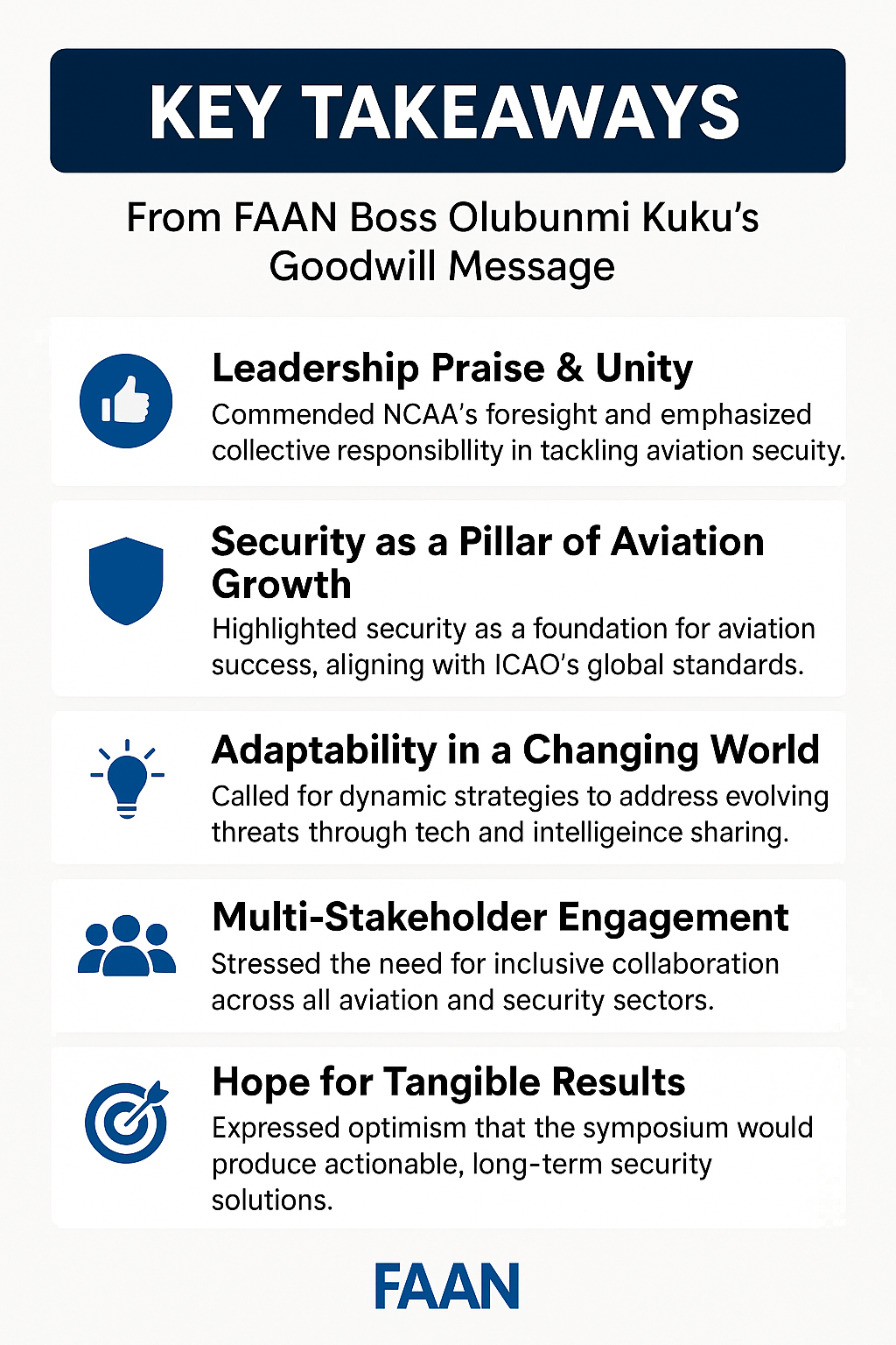 At a landmark symposium focused on aviation security, Mrs. Olubunmi Kuku, the Managing Director/Chief Executive of the Federal Airports Authority of Nigeria (FAAN), delivered a compelling goodwill message that underscored the urgency and necessity of securing Nigeria’s airspace through strategic collaboration and stakeholder engagement.