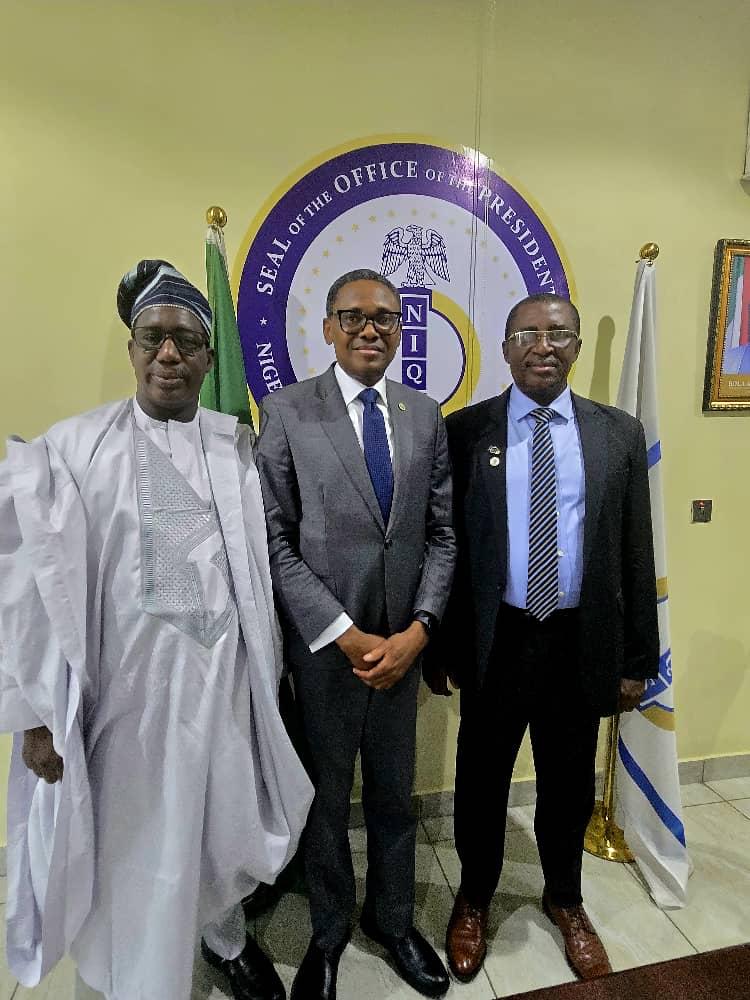 The Deputy Commissioner for Insurance, Finance and Administration, Mr. Ekerete Ola Gam-Ikon (middle), and the President of the Nigerian Institute of Quantity Surveyors (NIQS), QS Nzekwe Kene Christopher Lawrence, during a courtesy visit to NIQS Headquarters in Abuja yesterday, aimed at strengthening collaboration on compulsory insurance implementation.