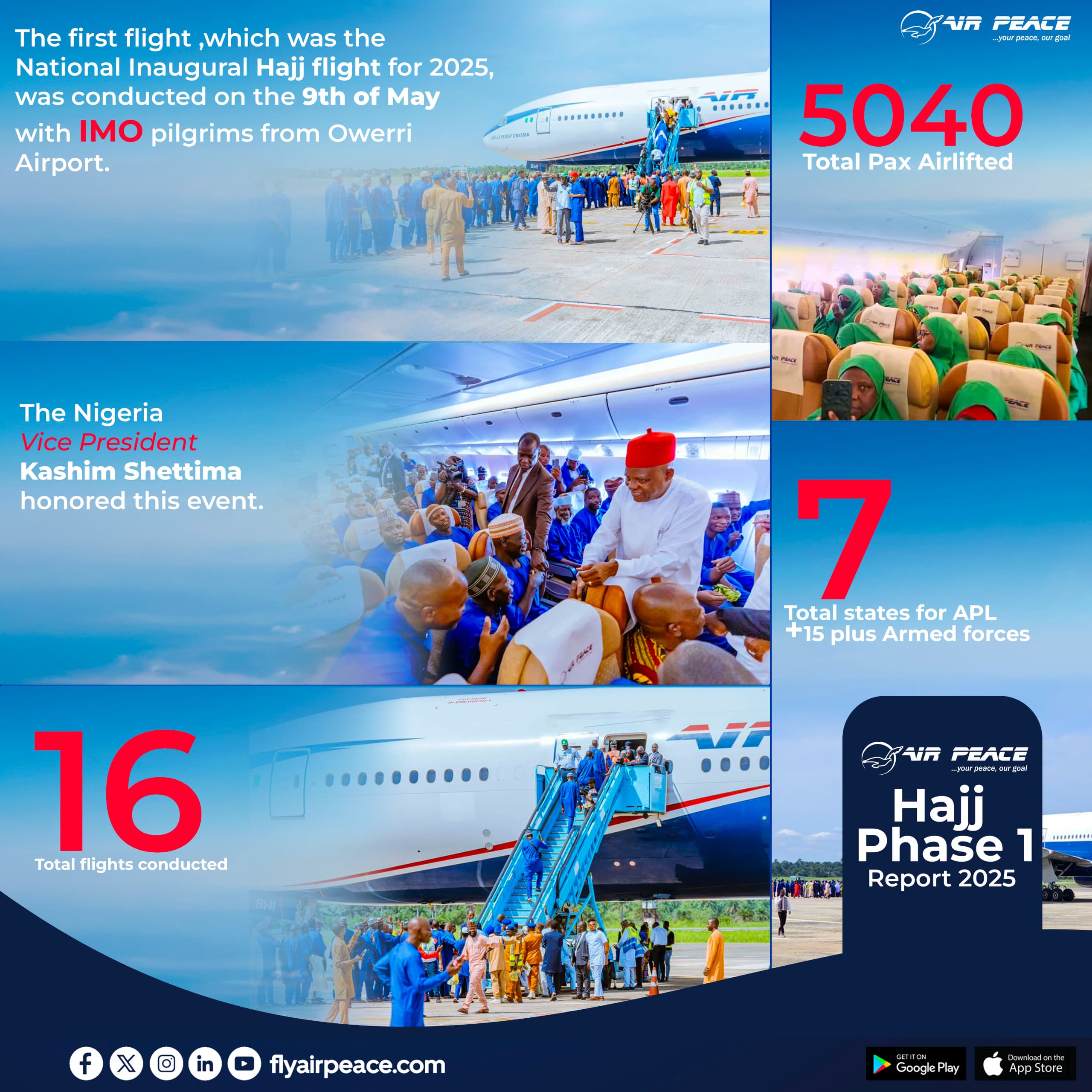 Air Peace facilitated the movement of pilgrims from 15 Nigerian states and the Nigerian Armed Forces, using six key airports across the country to enhance accessibility and logistical efficiency. The states and their respective departure airports were as follows: