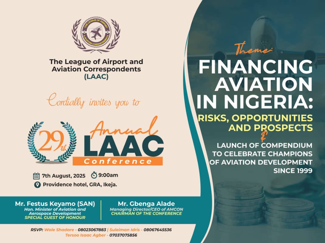 The League of Airport and Aviation Correspondents (LAAC) has announced that key figures in Nigeria’s aviation and finance sectors will headline its 29th Annual Conference, scheduled for Thursday, August 7, 2025, at The Providence Hotel, GRA Ikeja, Lagos.