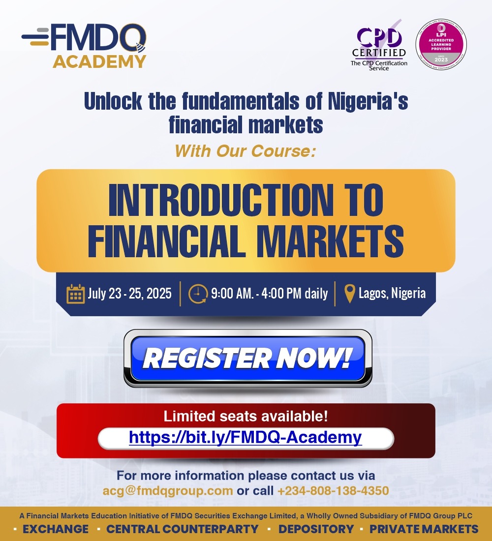 This course is part of the Academy’s expanding suite of market-focused programmes, designed to provide accessible, high-impact learning experiences that align with FMDQ Exchange’s broader agenda for market development. Notably, the course has received certification from the Continuing Professional Development (CPD) Certification Service and accreditation from the Learning and Performance Institute (LPI), UK – a testament of FMDQ Academy’s commitment to offering globally recognised, high-impact learning experiences.