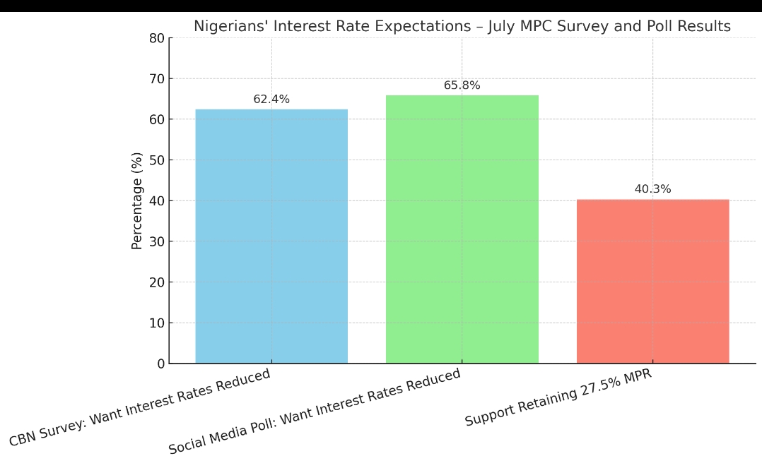 Here is a visual bar chart illustrating Nigerians’ interest rate expectations based on the July MPC Expectations Survey and a social media poll. It shows that: