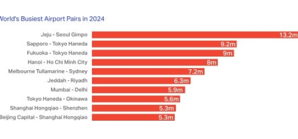 The Jeju-Seoul (CJU-GMP) route in South Korea was the busiest in the world with 13.2 million passengers. Nine of the top 10 busiest airport pairs were in Asia-Pacific. Only Jeddah-Riyadh (JED-RUH) in Saudi Arabia broke into the list from outside the region.