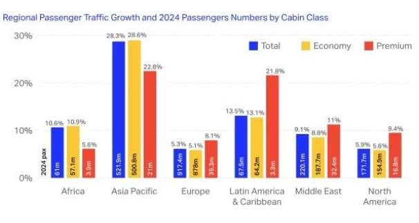 Europe led in volume with 39.3 million premium passengers, while the Middle East had the highest share of premium travelers at 14.7%. Asia-Pacific posted the fastest growth in premium travel at 22.8%, although economy class in the region grew even faster, up 28.6% to 500.8 million passengers.