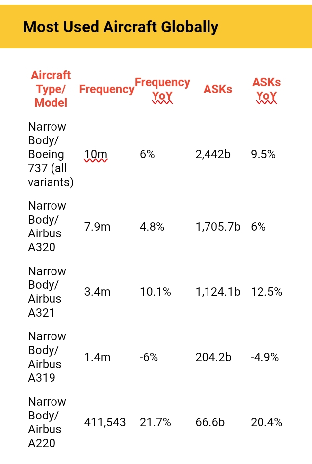 The Boeing 737 family remained the most used aircraft, flying 10 million times and delivering 2.4 trillion ASKs. The Airbus A320 and A321 followed closely with 7.9 million and 3.4 million flights respectively.