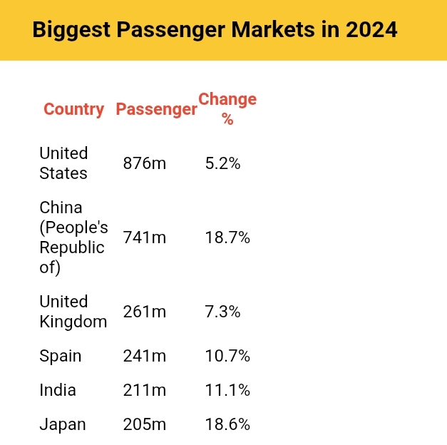 The United States remains the world’s biggest aviation market with 876 million passengers (+5.2%), followed by China with 741 million (+18.7%).