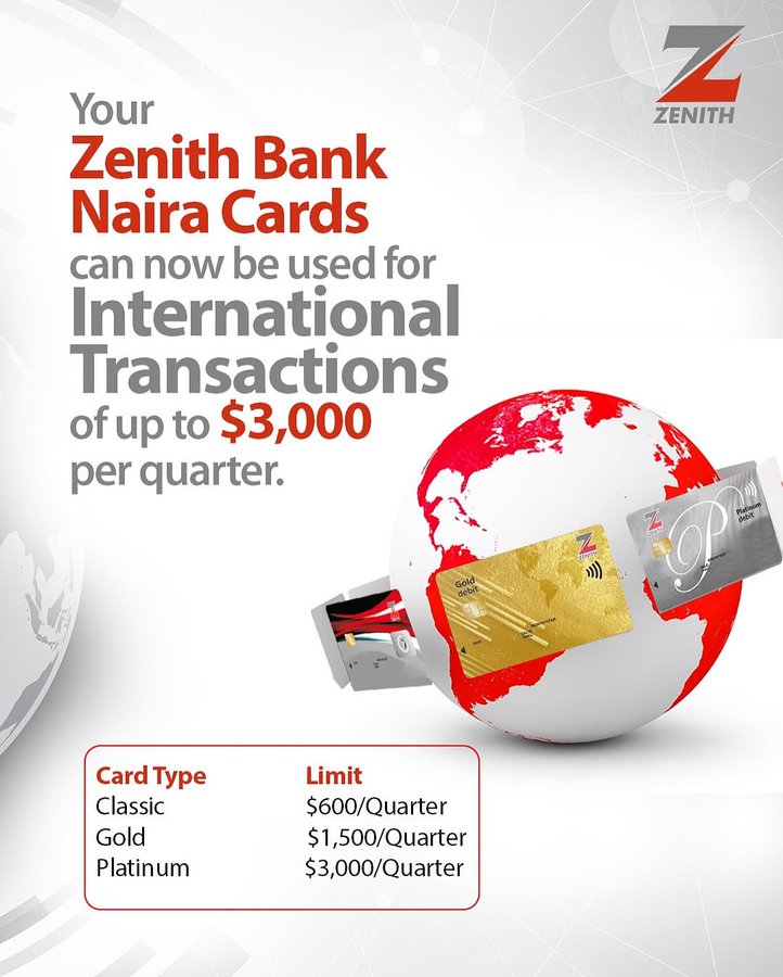 Zenith Bank has announced that its Naira debit cardholders can now make transactions internationally with a limit of up to $3,000 per quarter. This new feature enables customers to shop, travel, and conduct business abroad using their local currency cards, without the need for foreign currency exchanges.