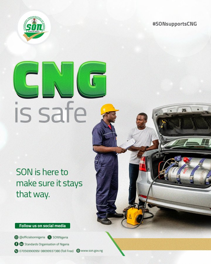 The Standards Organisation of Nigeria (SON) has assured motorists that Compressed Natural Gas (CNG) is a safe, cost-effective, and cleaner alternative to petrol.
