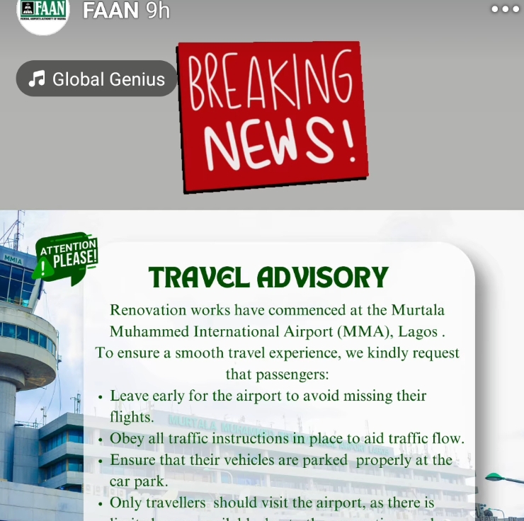 The Federal Airports Authority of Nigeria (FAAN) has issued a stern travel advisory to passengers using the Murtala Muhammed International Airport (MMA), Lagos, as major renovation works get underway.