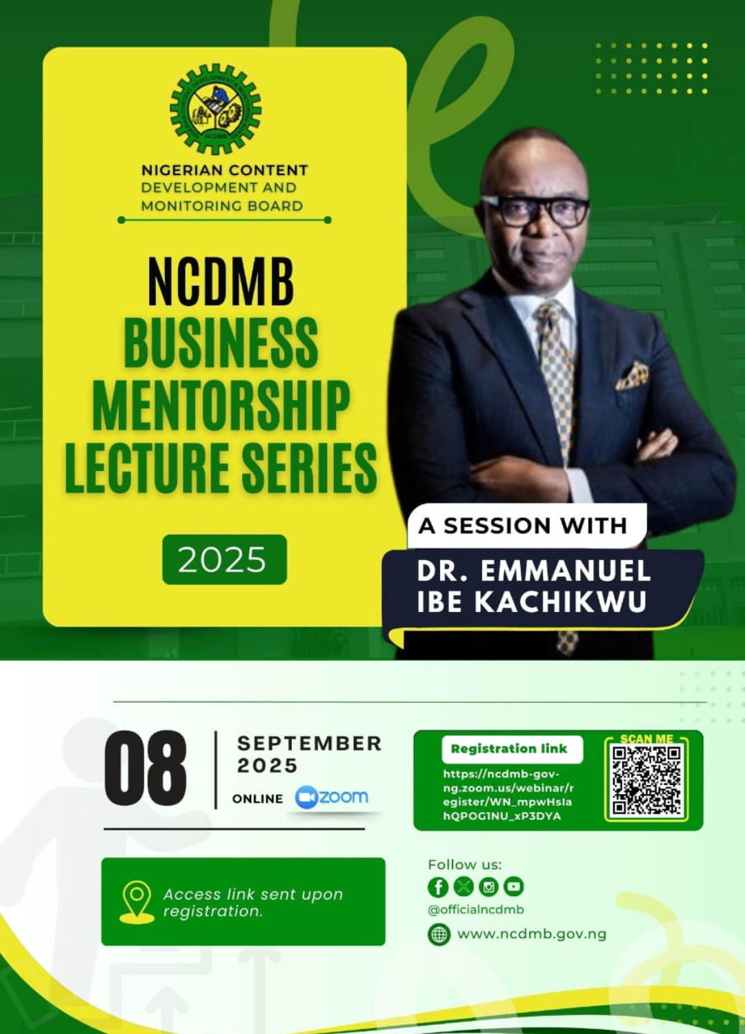 The Nigerian Content Development and Monitoring Board (NCDMB) has announced that Dr. Emmanuel Ibe Kachikwu, former Minister of State for Petroleum Resources and past Chairman of the NCDMB Governing Council, will headline the third-quarter edition of its Business Mentorship Lecture Series (BMLS).