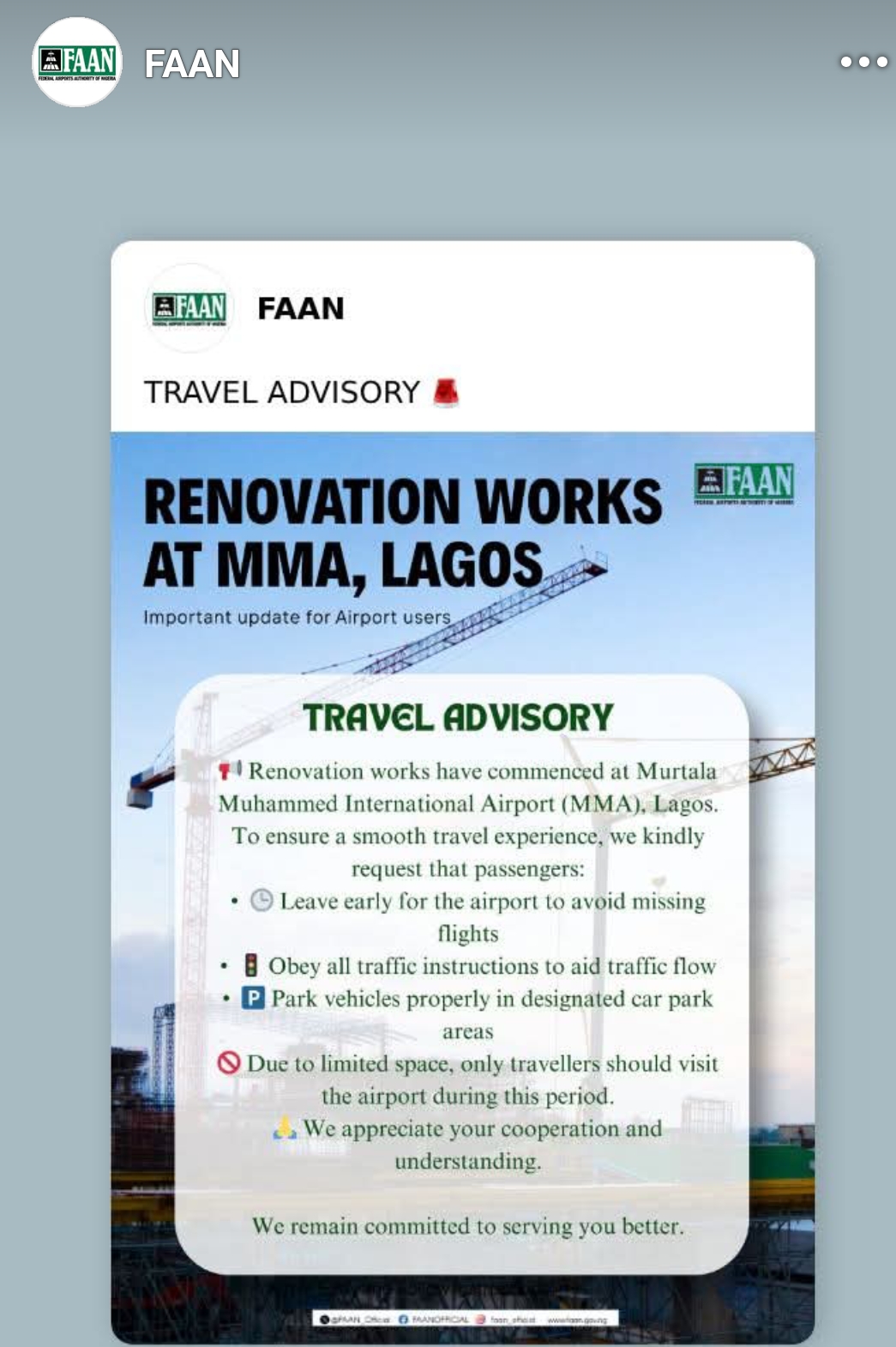 FAAN expressed appreciation to the public for their patience and understanding, adding that the renovations are a necessary step towards delivering safer, more efficient, and modern airport services.