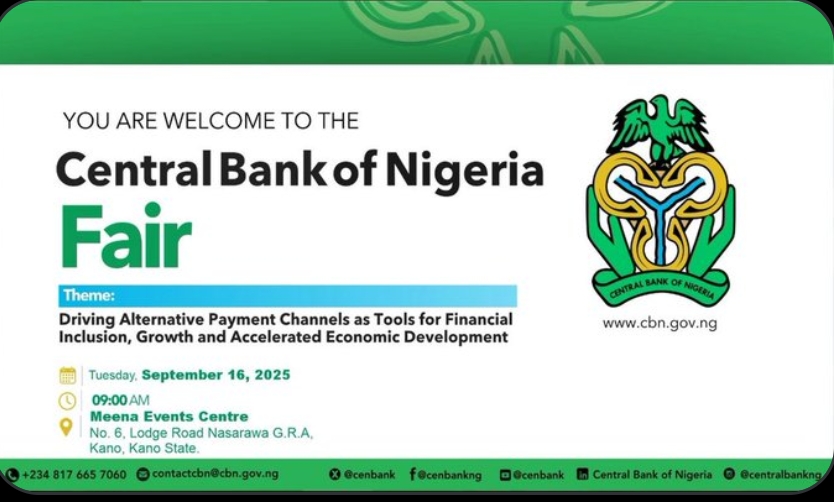 The Central Bank of Nigeria (CBN) has announced that its flagship CBN Fair will hold in Kano on Tuesday, September 16, 2025, as part of its continuous drive to deepen financial inclusion and accelerate economic growth through innovative payment systems.