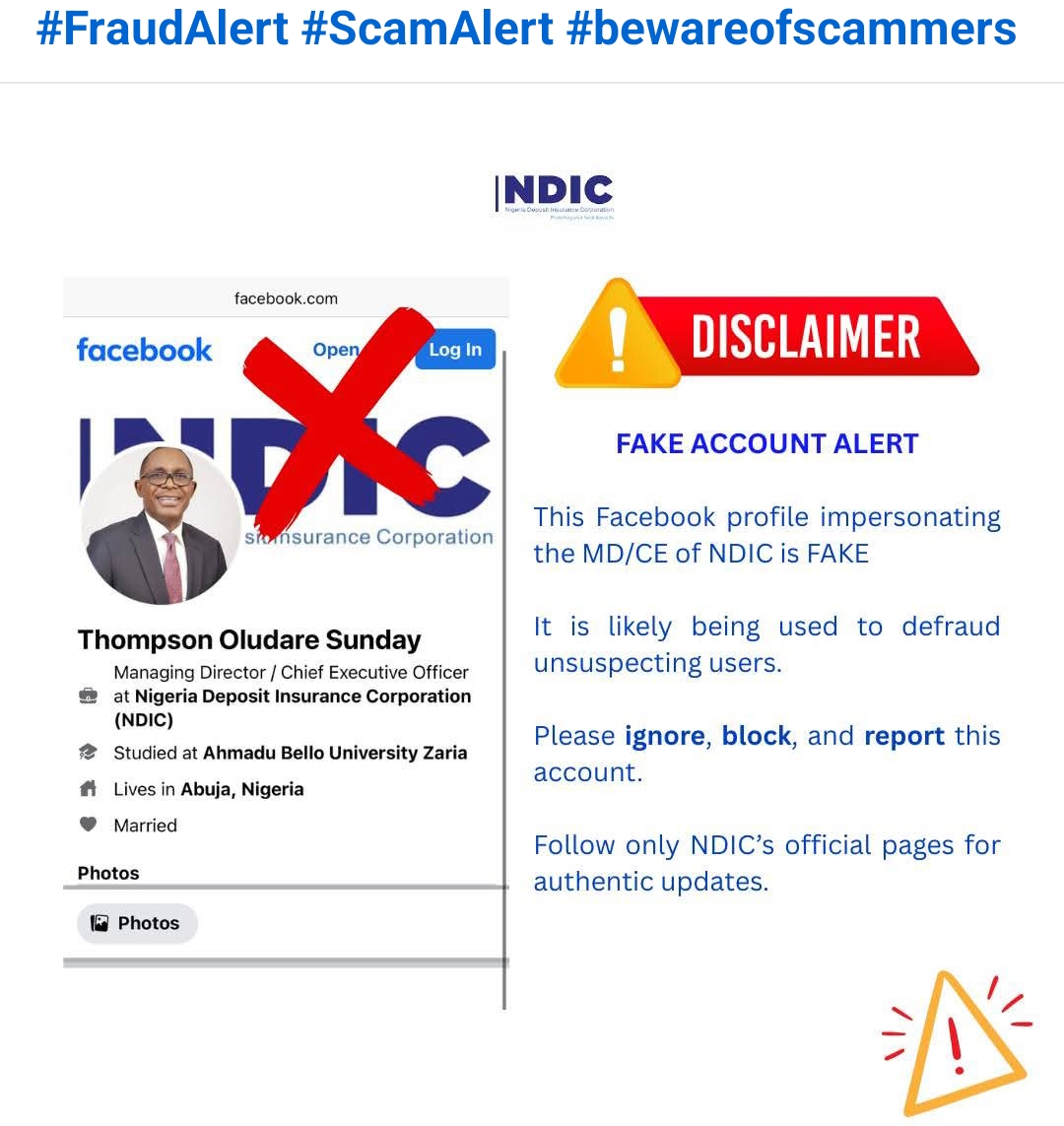 The Nigeria Deposit Insurance Corporation (NDIC) has raised a red flag over a fake Facebook account impersonating its Managing Director/Chief Executive Officer, Mr. Thompson Oludare Sunday. The fraudulent profile, which falsely presents itself as the NDIC boss, is suspected to be a tool for duping unsuspecting social media users into scams.