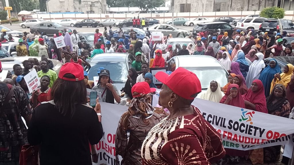 The demonstrators, under the banner of the Coalition of Civil Society Organisations (CSOs) Against Bank Fraud and Customers Victimisation, carried bold placards with inscriptions such as “Forgery,” “Criminal Impersonation,” “Stop Suffocating Your Customers,” and “Customers Should Stop Banking with Sterling Bank — Withdraw Your Money Immediately.”