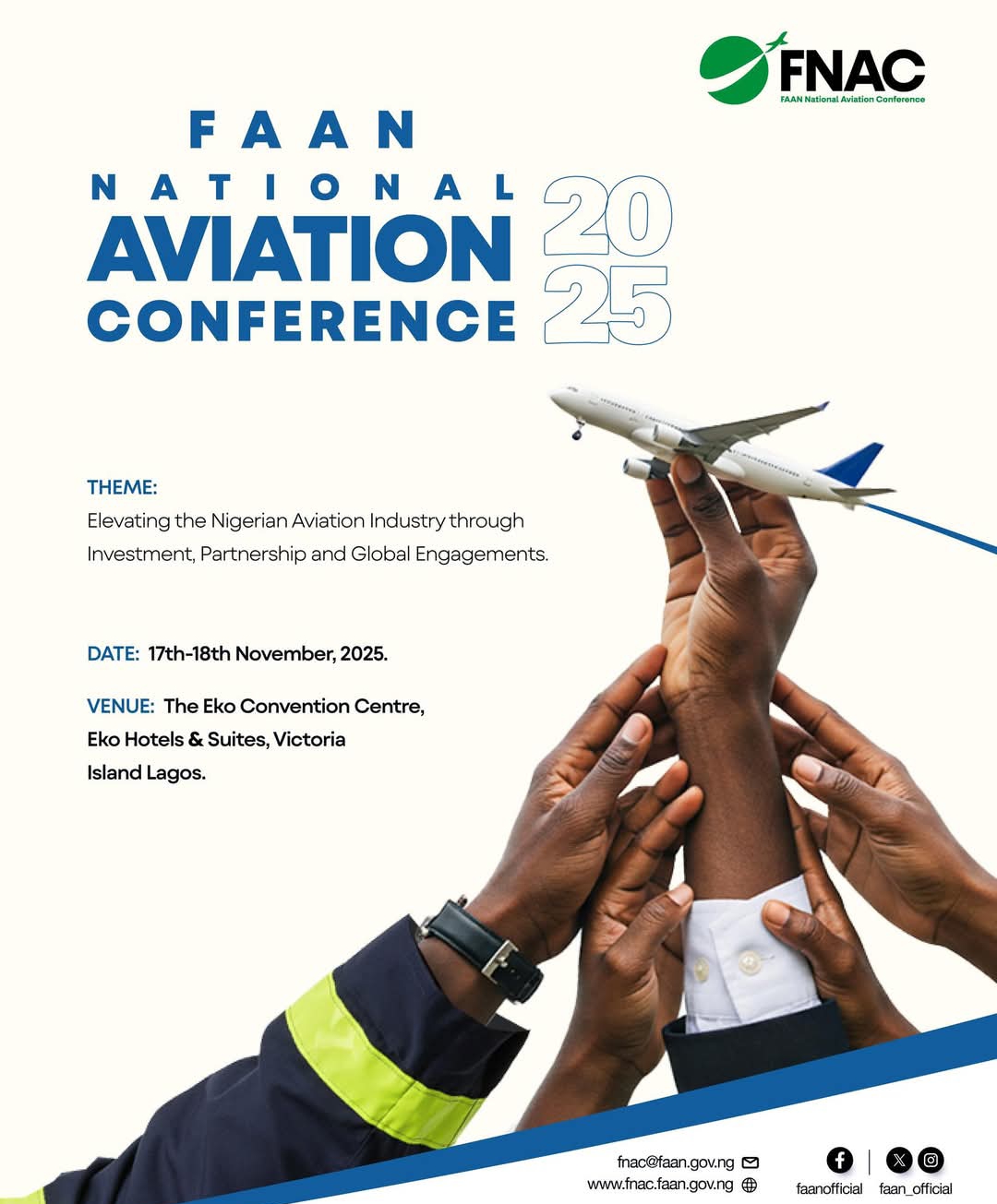 The FAAN National Aviation Conference 2025, scheduled for November 17–18 at Eko Convention Centre, Lagos, will bring together government leaders, investors, and aviation innovators to discuss partnerships, sustainability, and the future of Nigeria’s aviation industry.