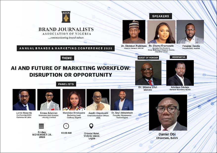 The Brand Journalists Association of Nigeria (BJAN) has launched the campaign for its 2025 Annual Brands & Marketing Conference, themed “AI and the Future of Marketing Workflow: Disruption or Opportunity.” The event will bring together top industry leaders to discuss how Artificial Intelligence is reshaping creativity, communication, and marketing innovation across Africa.