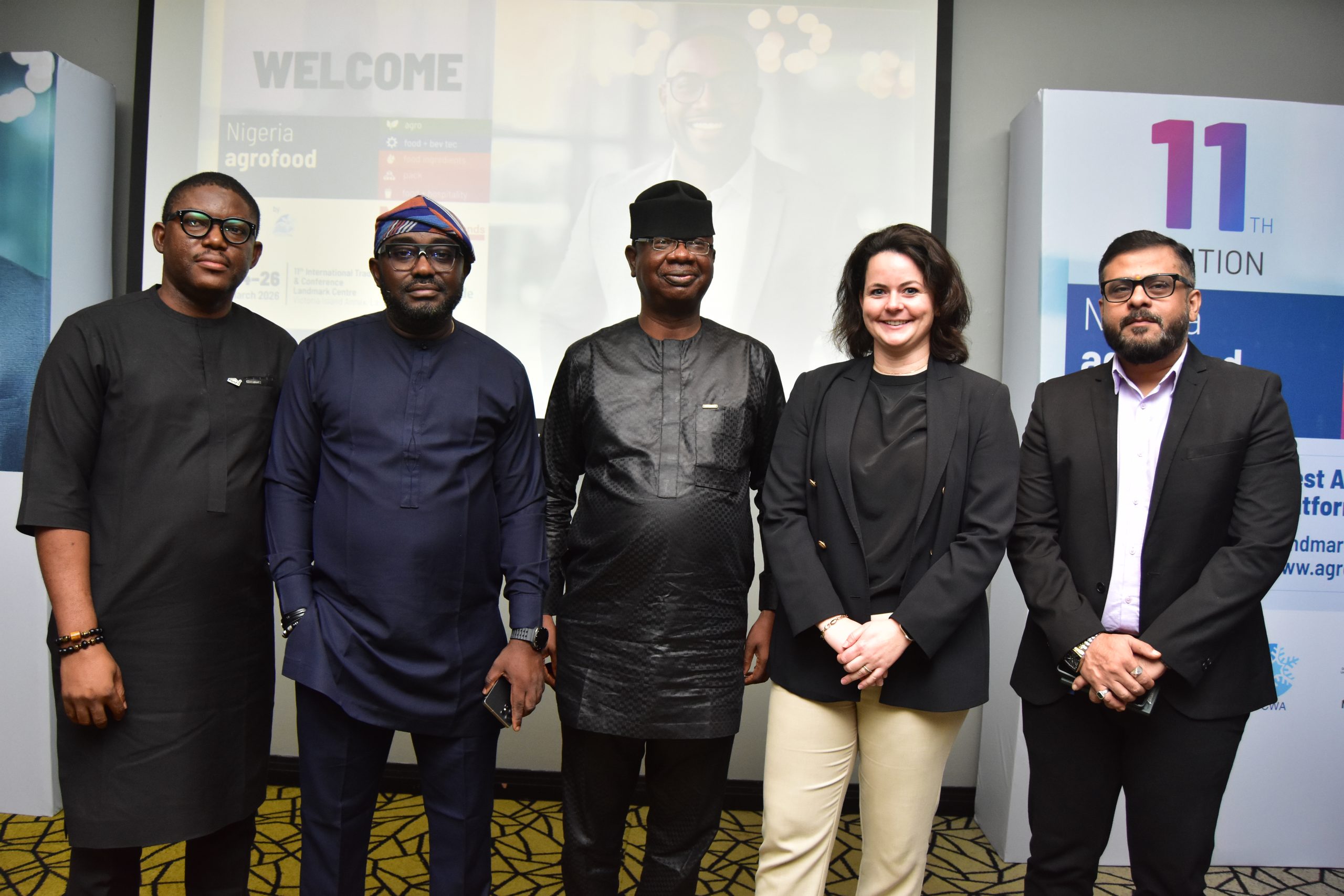 L-R: Public Relations Manager, Manufacturers Association of Nigeria (MAN), Salami Musa; Nigerian Partner, agrofood Nigeria, Odion Aleobua; Director General, Nigerian Association of Chambers of Commerce, Industry, Mines and Agriculture (NACCIMA), Engr. Olushola Obadimu; Exhibition Director, fairtrade Messe, Freyja Djeten and Institution Head Sales, Kamlesh Pitale, SIMBA TVS, at the Media and Stakeholders Parley, in preparation for the 11th edition of the agrofood Nigeria Tradeshow and Conference scheduled for March 24 – 26, 2026, in Lagos.