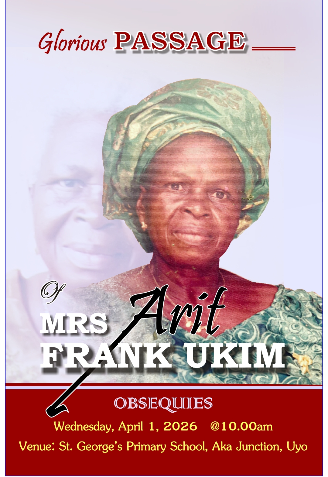 The family of Frank Ukim of Uyo Clan in Uyo Local Government Area of Akwa, has announced the glorious passage of their beloved wife, mother, and grand mother, Mrs Arit Frank Ukim who departed this world on Sunday, December, 21, 2025.