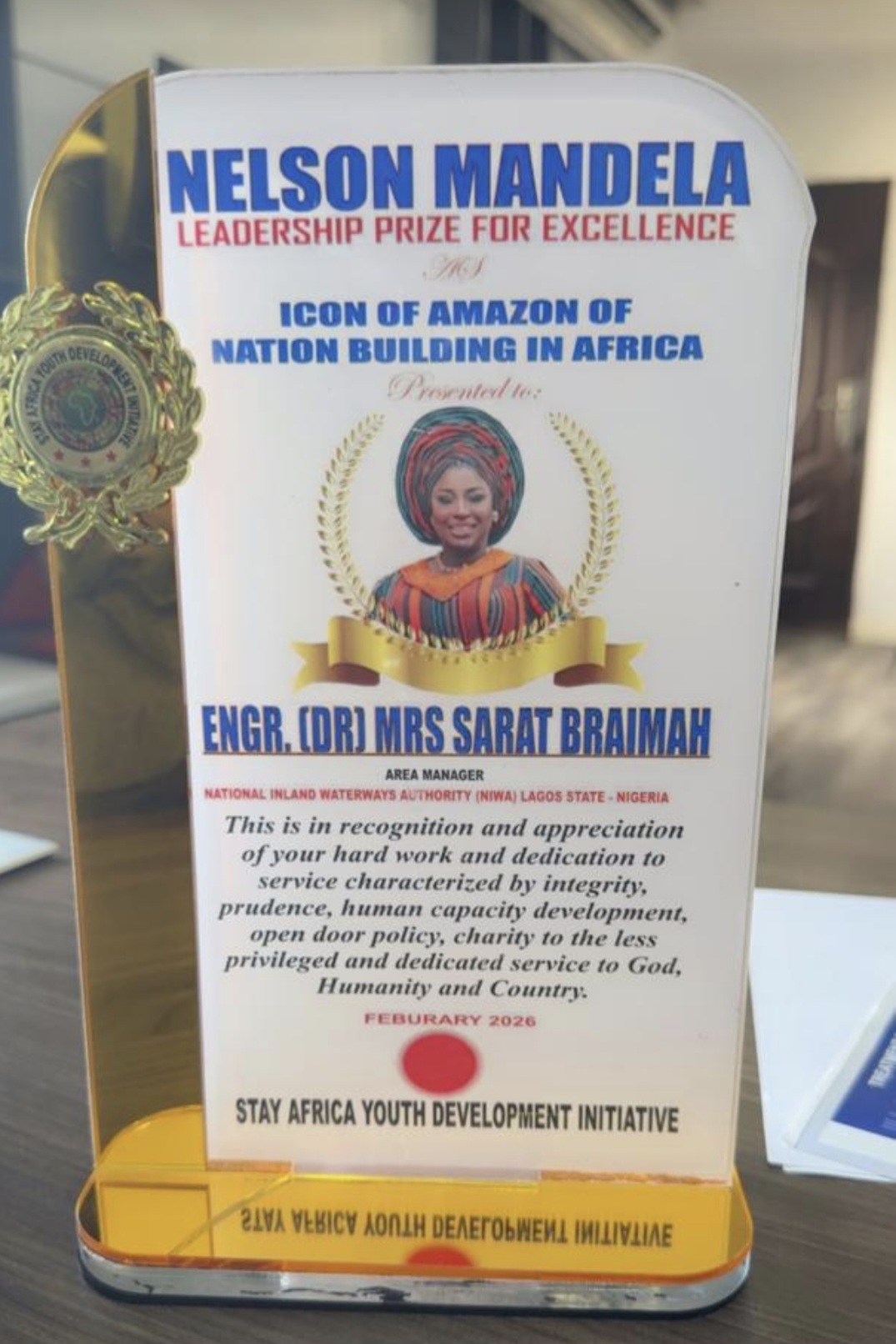 Engineer Sarat Braimah, Lagos Area Manager of the National Inland Waterways Authority (NIWA), has been conferred with the prestigious Nelson Mandela Pan African Leadership Award by the Stay Africa Youth Development Initiative (SAYDI), in recognition of her outstanding leadership, commitment to national service, and dedication to youth and community empowerment.