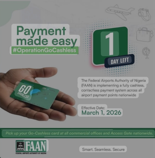 FAAN announces the official launch of Operation Go Cashless, a fully cashless, contactless payment system at airports, effective March 1, 2026. Passengers urged to pick up Go-Cashless cards and ignore fake SMS alerts.
