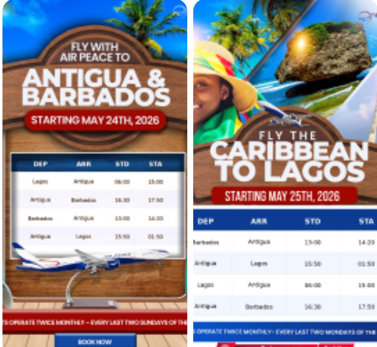 Tickets for the Lagos–Antigua–Barbados route are now available via the airline’s official booking channels and accredited travel agencies, with early bookings strongly advised due to anticipated demand.