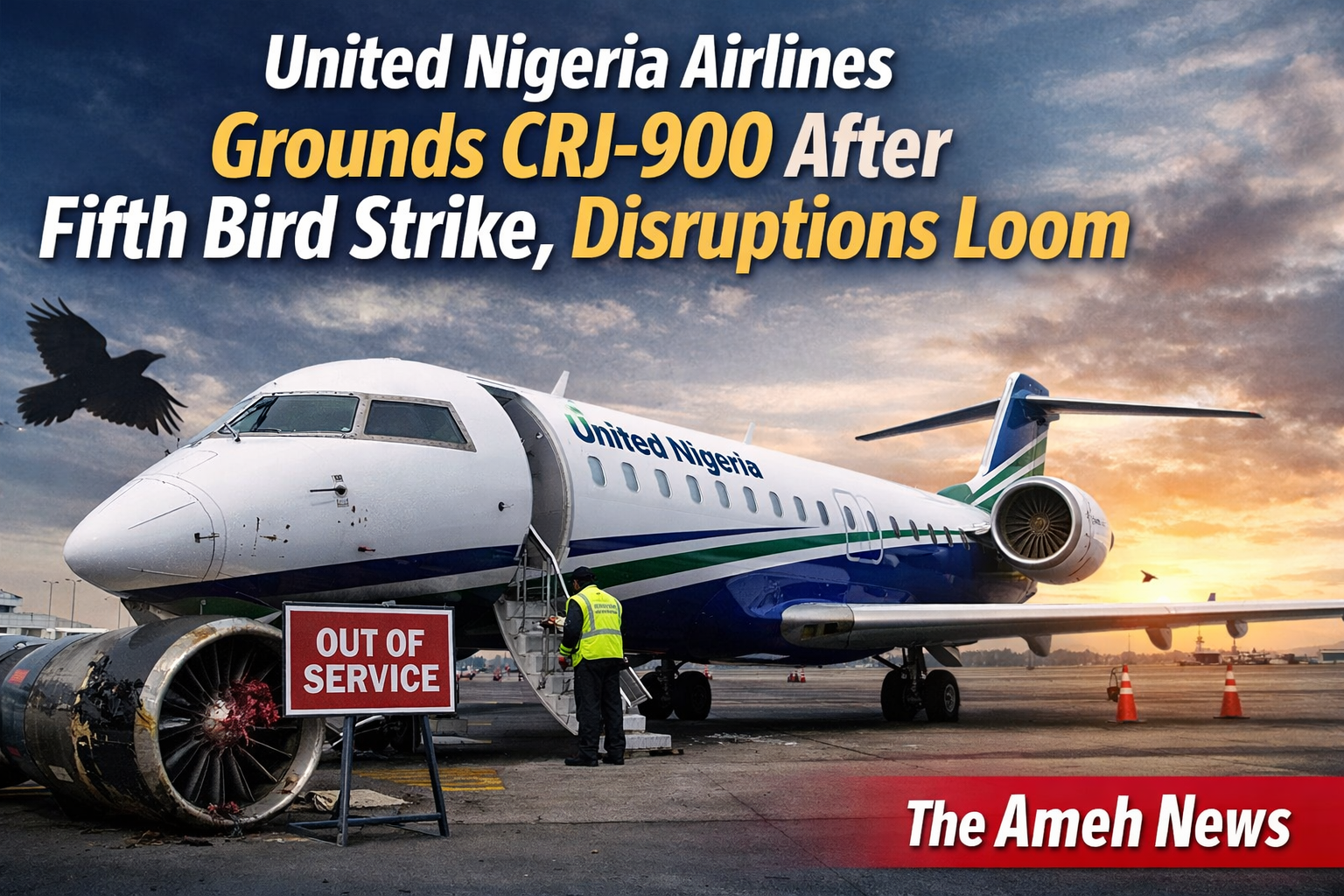 United Nigeria Airlines grounded a CRJ-900 aircraft after a bird strike during landing in Abuja, marking its fifth incident in 2026 and causing potential flight disruptions.